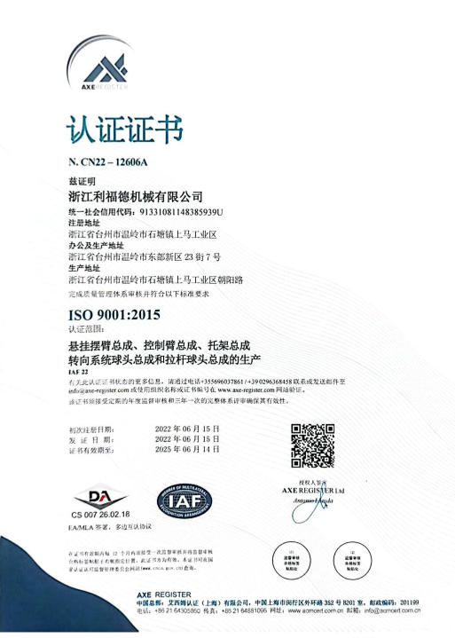 浙江利福德機械有限公司座落于中國大陸新世紀、新千年第一縷曙光首照地——溫嶺。是專業生產汽車懸掛擺臂總成、托架總成、球頭總成、襯套、后橋等系列產品等系列產品的大型汽車零部件制造企業,遠銷歐、美及世界各地區。公司創建于1992年,現有兩個廠區,A廠區位于溫嶺市石塘鎮上馬工業區,B廠區位于溫嶺市東部新區23街7號,二十多年來一直奉行“顧客滿意”的宗旨,“人本管理、誠信經營、注重品質、力求雙贏”的理念。依靠科學管理、先進技術、優質產品和服務,贏得了國內外客戶的好評,產品遠銷歐、美等世界各地。
