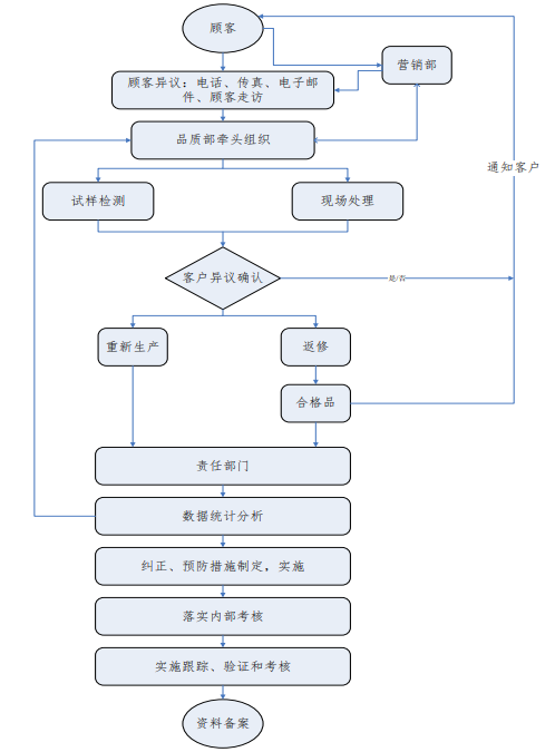 投訴的處理流程:銷售部負責收集客戶信息,接收和處理客戶的投訴,流程見圖6.1投訴管理流程。品質部的職責是:客戶質量投訴、三包索賠、外部退/換貨接收處理;業務員外部質量處理支持、重大售后服務的組織與落實;協助業務員做好質量信息的處理回復;客戶質量要求識別輸入與管理;與公司品質部等職能部門接口做好售后服務工作;外部質量運行、客戶質量滿意度分析與組織改善等。最大限度減少顧客不滿和業務流失。